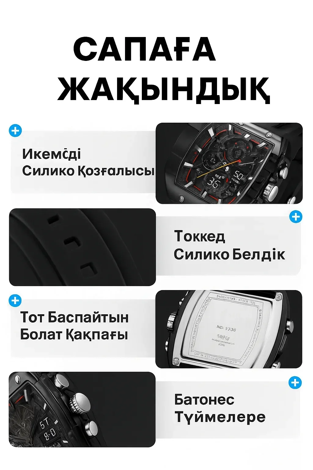 Жоғары сапалы материалдардан жасалған бұл сағат дәл кварцтық механизммен, икемді силикон баумен және тот баспайтын болаттан жасалған артқы қақпақпен жабдықталған. Тайғанамайтын батырмалары қарқынды қозғалыс кезінде де ыңғайлы пайдалануға мүмкіндік береді. Әрбір бөлшегі ұзақ мерзімділік пен жайлылықты бейнелейді.